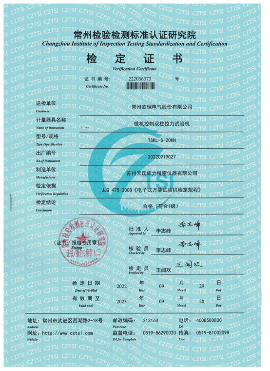 常州檢驗檢測標(biāo)準(zhǔn)認證研究院檢定證書
