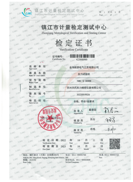 鎮(zhèn)江市計(jì)量檢定測試中心檢定證書