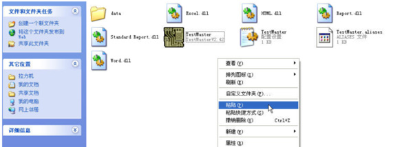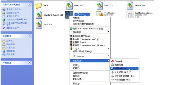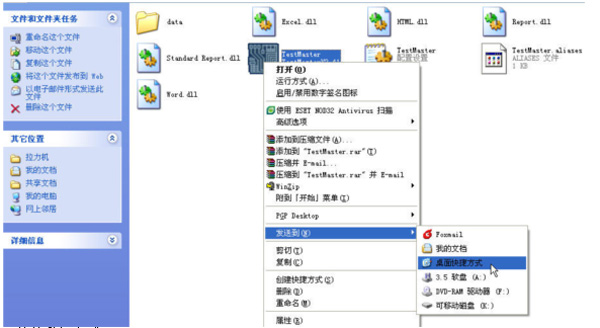 5.刪除桌面上的快捷方式”TestMater”,然后為新版本軟件制作一個新的快捷方式:鼠標右鍵單擊新版本軟件所在文件夾中的”TestMaster”程序,再鼠標左鍵單擊下圖所示的”桌面快捷方式”選項,桌面上就會有了一個新版本軟件的快捷方式: