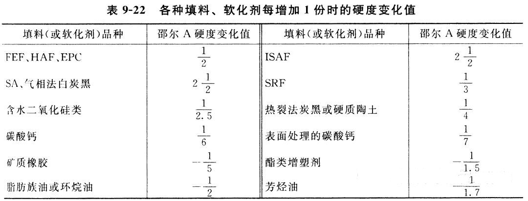 在實際配方設(shè)計時,當已確定主體材料、硫化體系,根據(jù)不同填料對橡膠的補強效果和軟化劑的軟化效果來估計。通常將非填充橡膠的基本硬度,加上填充劑增加的硬度減去增塑劑降低的硬度,來估計硫化膠最終的硬度。或者反過來,根據(jù)所要求的硫化膠的硬度估算填料和增塑劑的用量。