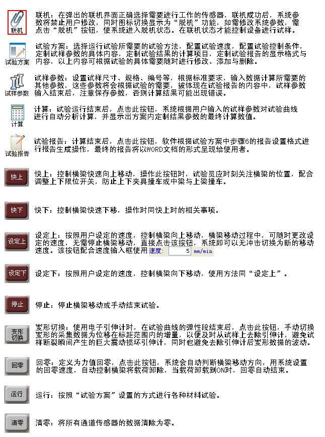 檢查限位開關位置是否正確設置-----打開設備電源---確認設備電源指示燈已亮起---打開測控軟件----點擊聯(lián)機----確認聯(lián)機成功----開始試驗