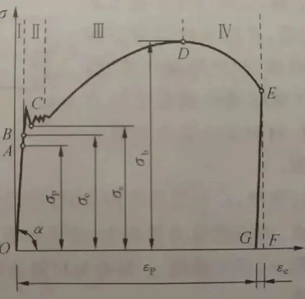 通過對上述關(guān)于強(qiáng)度和剛度的理論理解,相對于剛度,強(qiáng)度的定義針對的是外力作用下的破壞;而破壞類型的分類為塑性屈服及脆性斷裂,由此聯(lián)想到拉伸時的應(yīng)力應(yīng)變曲線。如圖所示。
