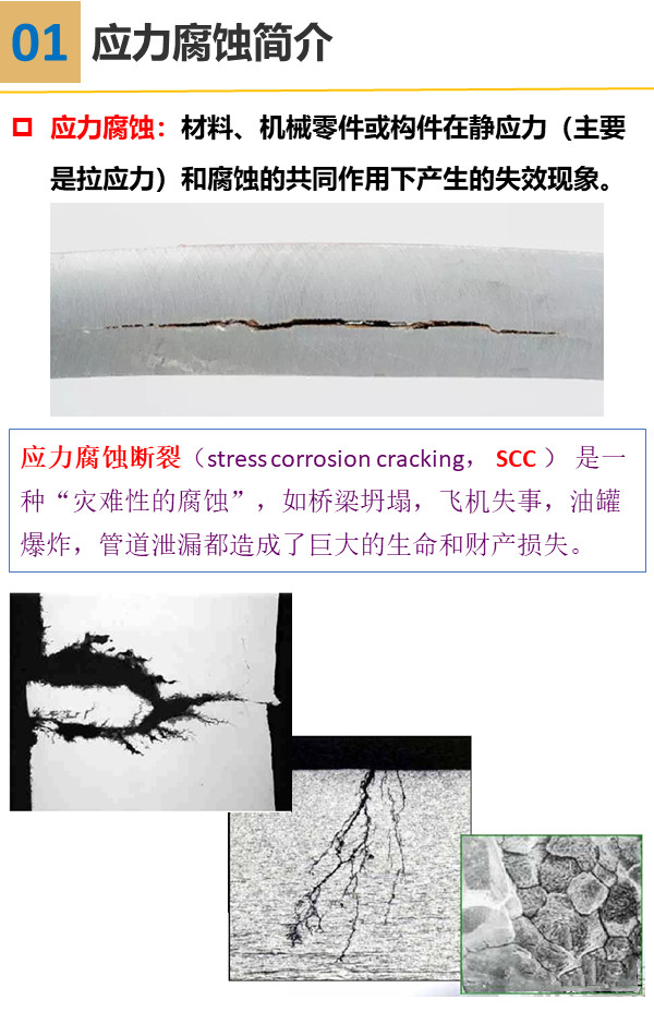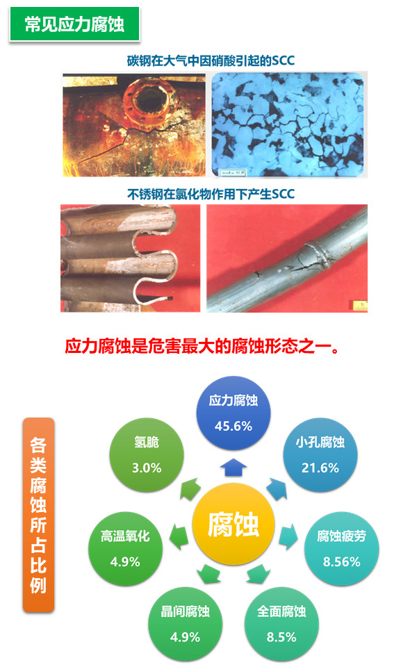 應力與環境共同作用下的腐蝕是局部腐蝕的一大類型。材料除受環境作用外還受各種應力作用,因此會導致較單一因素下更嚴重的腐蝕破壞形式。