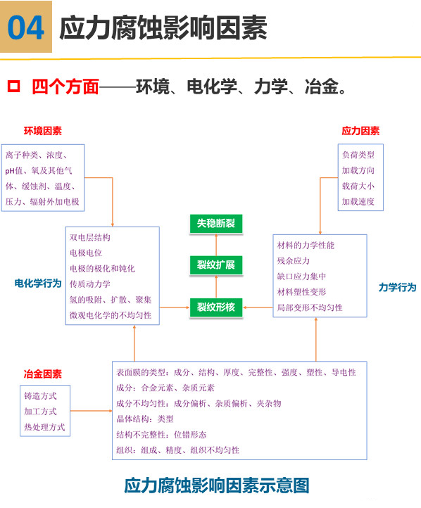 材料應力腐蝕具有很鮮明的特點,應力腐蝕破壞特征,可以幫助我們識別破壞事故是否屬于應力腐蝕,但一定要綜合考慮,不能只根據某一點特征,便簡單地下結論。影響應力腐蝕的因素主要包括環境因素、力學因素和冶金因素。