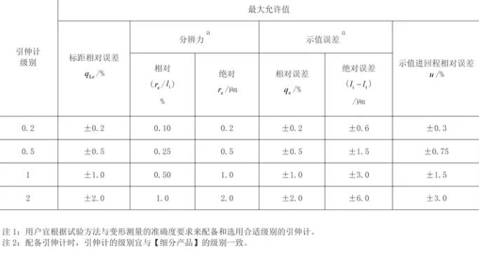 引伸計的標距相對誤差、示值誤差、示值進回程相對誤差、分辨力應符合下表的規定。