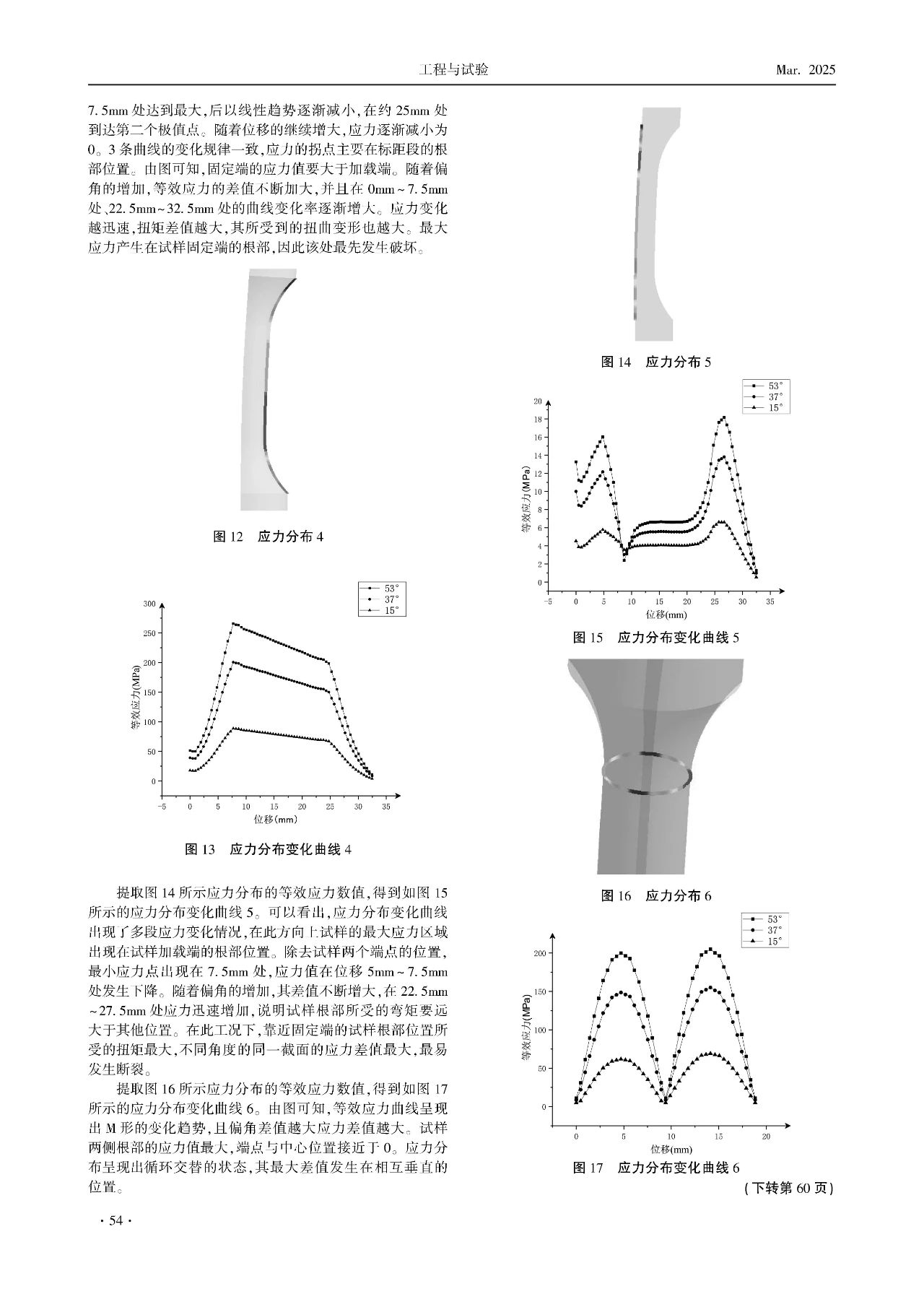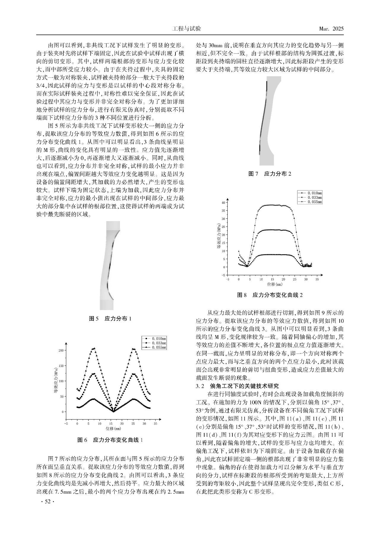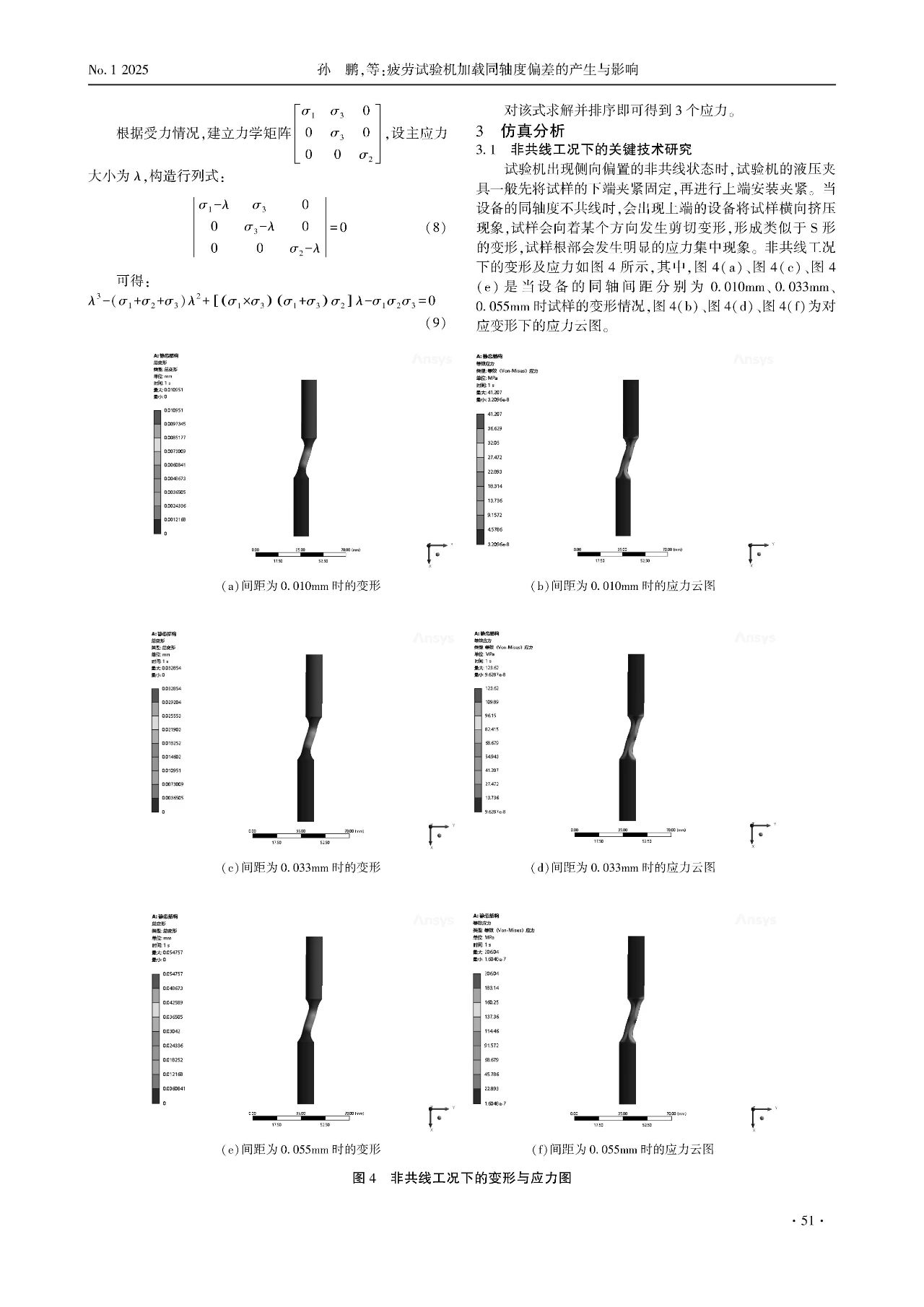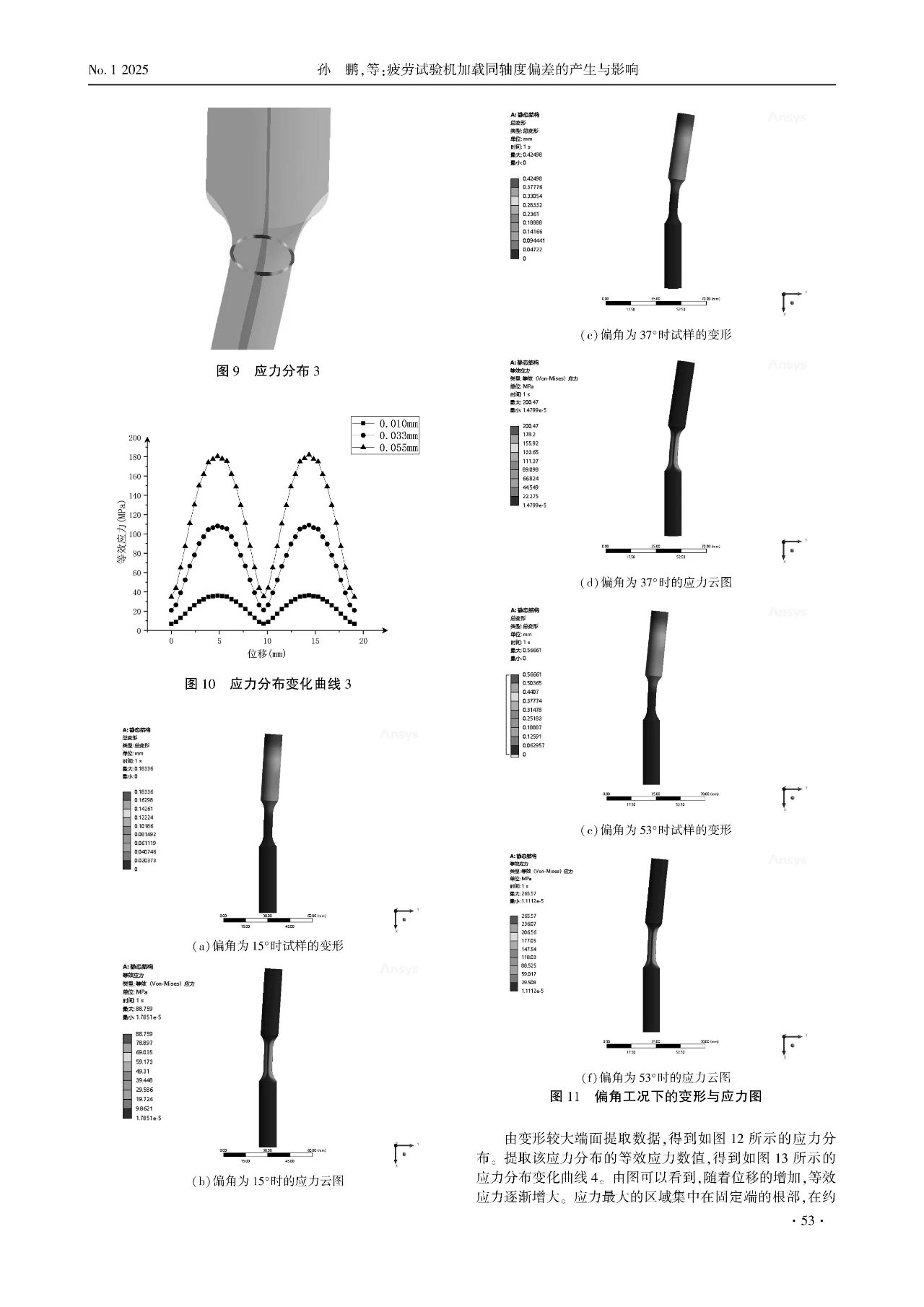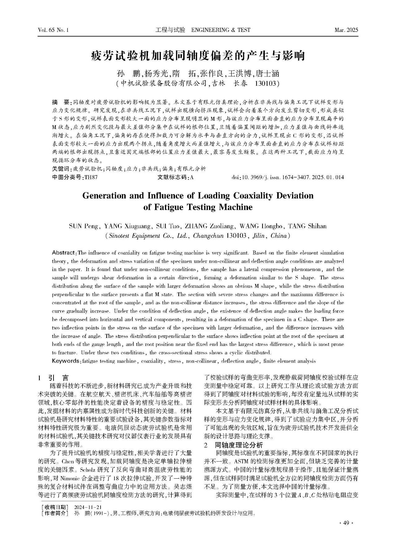 同軸度對疲勞試驗機(jī)的影響極為顯著。本文基于有限元仿真理論,分析在非共線與偏角工況下試樣變形與應(yīng)力變化規(guī)律。研究發(fā)現(xiàn),在非共線工況下,試樣出現(xiàn)橫向擠壓現(xiàn)象,試樣會向著某個方向發(fā)生剪切變形,形成類似于S形的變形,試樣表面變形較大一面的應(yīng)力分布呈現(xiàn)明顯的M形,與該應(yīng)力分布呈面垂直的應(yīng)力分布呈現(xiàn)扁平的M狀態(tài),應(yīng)力劇烈變化段與最大差值部分集中在試樣的根部位置,且隨著偏置間距的增加,應(yīng)力差值與曲線斜率逐漸增大。在偏角工況下,偏角的存在使得加載力可分解為水平與垂直方向的分力,試樣呈現(xiàn)出C形的變形,沿試樣表面變形較大一面的應(yīng)力出現(xiàn)兩個拐點,隨著角度增大而差值增大,與該應(yīng)力分布呈面垂直的應(yīng)力分布在試樣標(biāo)距兩端的根部出現(xiàn)拐點,且靠近固定端根部的位置應(yīng)力差值最大,最容易發(fā)生斷裂。在這兩種工況下,截面應(yīng)力均呈現(xiàn)循環(huán)分布的狀態(tài)。
